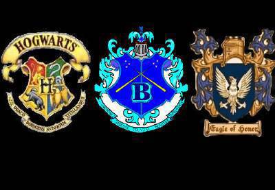 Les logos des trois écoles de sorciers,il y a poudlard,beauxbatons et durmstrang.